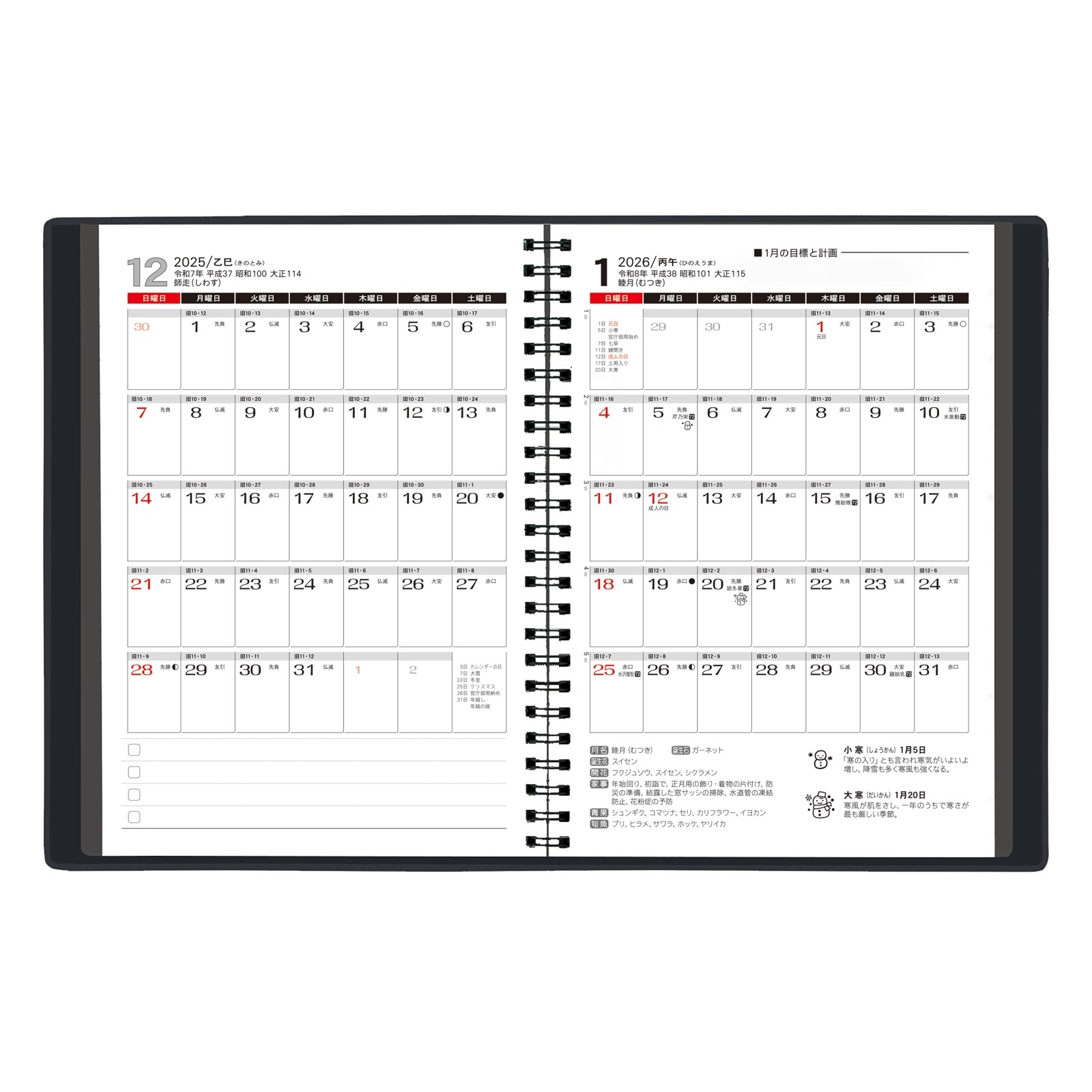 ベーシックな黒の装丁なので、ビジネスはもちろんプライベートにも使える、カレンダー専門メーカーが作った暦情報満載の手帳です。